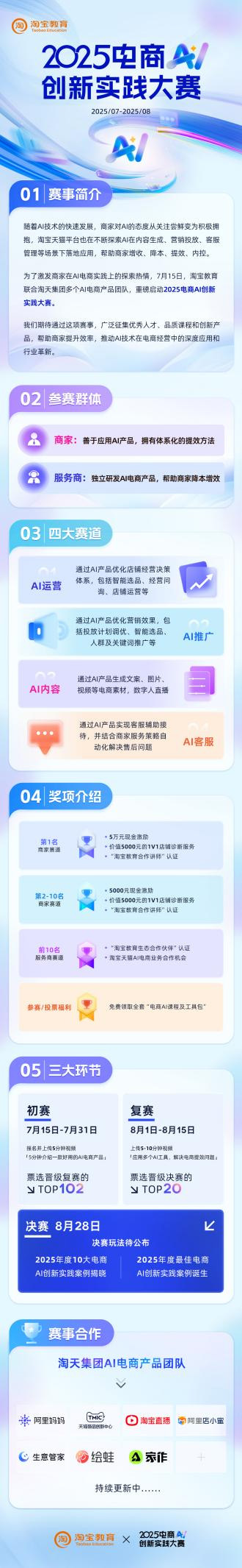 7月15日,淘寶教育正式啟動「2025電商AI創(chuàng)新實踐大賽」,旨在發(fā)掘和推廣AI電商最佳實踐案例,幫助商家抓住AI重塑經(jīng)營的時代紅利。