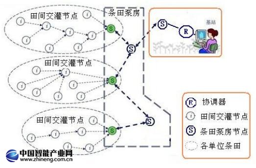 網絡采用二級網絡方式。中心(協調器)和泵房控制器之間的網絡是一級網絡,也稱泵房網絡。中心為一級網絡的中心。泵房控制器(市電供電的無線模塊節點)和泵房所管的條田里的控制器(電池供電節點)之間的網絡是二級網絡。也稱條田網絡。