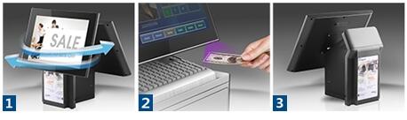 1.獨(dú)特的塔型結(jié)構(gòu)設(shè)計(jì),節(jié)省柜臺空間,并配有可調(diào)式第二顯示屏