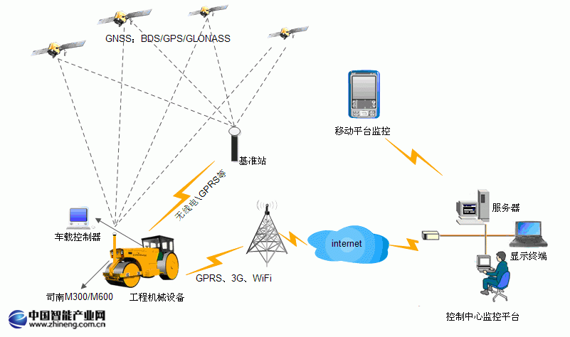 使用北斗等GNSS多星系統(tǒng)聯(lián)合高精度定位,可以把衛(wèi)星定位的三維坐標(biāo)實(shí)時的輸入機(jī)載計(jì)算機(jī),自動生成三維數(shù)字模型,機(jī)載計(jì)算機(jī)實(shí)時比較工程機(jī)械作業(yè)端的當(dāng)前位置和設(shè)計(jì)數(shù)據(jù),并輸出校正控制信號及控制設(shè)備,對機(jī)械的作業(yè)端進(jìn)行控制,主要施工機(jī)械只需要1-2次往返施工,即可達(dá)到設(shè)計(jì)位置,這種以絕對坐標(biāo)X、Y、Z為基準(zhǔn)的全新控制方式,摒棄了測量、打樁、放樣等傳統(tǒng)工序,一次性解決高程控制、平整度控制、坡度控制等等問題,節(jié)省了大量的現(xiàn)場測量工作,把工程機(jī)械操作手從繁重的整平工作中解放出來,使他可以專注于駕駛,大量提高了施工現(xiàn)場的工作效率及安全性,同時也可以將數(shù)據(jù)傳遞到控制中心進(jìn)行質(zhì)量控制。系統(tǒng)組成示意圖如下: