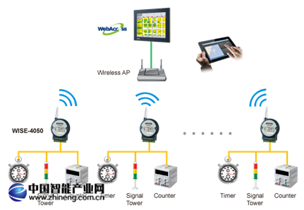 研華以物聯(lián)網(wǎng)無線I/O模塊WISE-4050搭配圖控軟件WebAccess整合,構(gòu)建出架構(gòu)簡(jiǎn)潔的產(chǎn)線監(jiān)測(cè)解決方案。具有多通道數(shù)字輸入/輸出功能的WISE-4050負(fù)責(zé)在生產(chǎn)現(xiàn)場(chǎng)連接三色燈及計(jì)數(shù)和計(jì)時(shí)傳感器,并將采集到的數(shù)據(jù)以無線傳輸方式上傳至系統(tǒng);而中控室的HMI/SCADA軟件WebAccess則會(huì)將傳來的前端信息以實(shí)時(shí)、動(dòng)態(tài)的圖像顯示于計(jì)算機(jī)屏幕,讓管理者無需到現(xiàn)場(chǎng)即可監(jiān)控產(chǎn)線設(shè)備狀況,完整記錄的數(shù)據(jù)與定期產(chǎn)生的報(bào)表還可協(xié)助用戶進(jìn)行設(shè)備使用率分析。