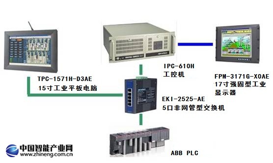 根據客戶的要求,推薦IPC+FPM作為中控柜的應用,TPC-1571H作為現場控制端的平板電腦,鑒于客戶需要連接ABB的PLC,考慮到下端需要連接ABB PLC,中控柜以及現場控制端都需要對PLC進行操作,所以推薦使用研華工業交換機。以便組成局域網。