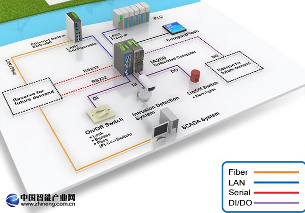 Moxa IA260有8+8 路DI/DO控制on/off開關系統、入侵檢測及報警燈光系統。另外,某些DI/DO可保留以備后續使用。雙LAN端口(一個固定IP,一個可配置端口)允許數據從PLC向以太網交換機傳輸數據,然后交換機將數據傳送至SCADA系統。另外,一個緊湊閃存插槽和額外串行接口(4個串行端口)可用于以后的存儲擴展及使用。