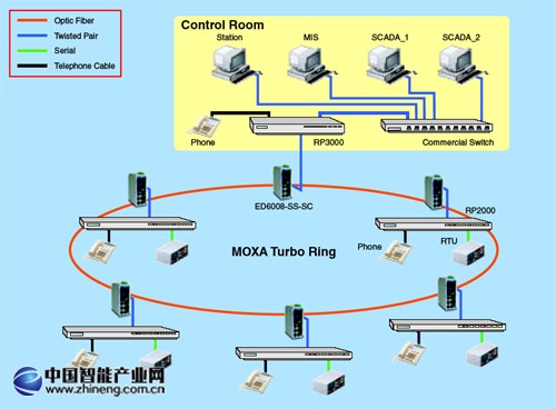 由EDS-408A工業以太網交換機和RP3000/200組成的這個光傳輸網絡,完全滿足了客戶現場RTU數據和語音數據的傳輸。MOXA工業以太網交換機在電力行業中有著更廣泛的應用。
