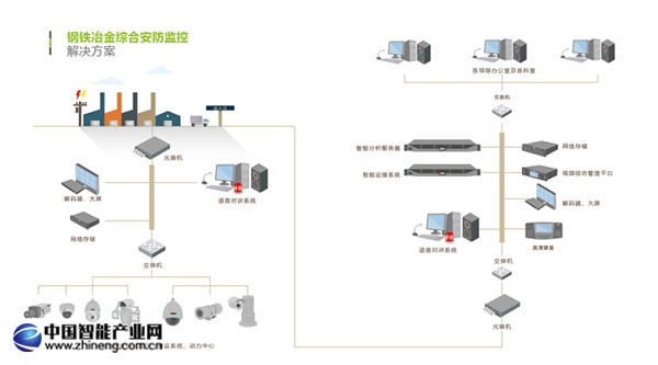 鋼鐵冶金綜合安防系統包含工業園區綜合安防系統和生產過程工業監控系統兩個子系統,構建了一整套由生產到生活、從外到內、由點到面、被動加主動的立體、綜合、嵌套式防御體系。