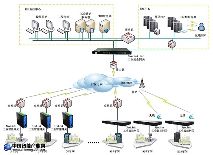 Symlink工業物聯網智能網關可以通過串口、以太網、CAN總線等方式將工廠中各個生產車間的儀表、控制器、DCS等設備上的實時數據采集上來,再以MES層所要求的協議方式統一推送至上層平臺,實現了生產數據從分散到歸一的過程。