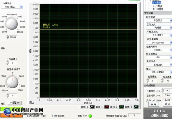 這一部分是EM9636BD數(shù)據(jù)采集卡的應(yīng)用,在這一部分中,最重要的是采集參數(shù),其中包括物理信道的選擇,采樣方式,采樣率,采樣通道數(shù),分辨率,時(shí)鐘源等設(shè)置。數(shù)據(jù)保存是把采集來的數(shù)據(jù)保存到DAT文件里,可以通過LabVIEW編寫的程序回放,數(shù)據(jù)采集程序如圖4.2所示、數(shù)據(jù)回放界面如圖4.3所示。
