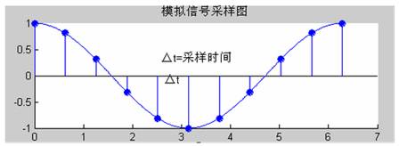 如果此刻對(duì)一個(gè)模擬信號(hào)x(t)每隔△t間隔采樣一次。時(shí)間間隔△t被叫做采樣間隔或者采樣周期。它的倒數(shù)l/△t被稱為采樣頻率,單位是采樣數(shù)/每秒。 t=0,△t,2△t,3△t...等等,x(t)的數(shù)值就被稱為采樣值。所有的x(0),X(△T),X(2 T)的采樣值。所以數(shù)據(jù)信息所表示的離散的點(diǎn)可以用一組分散的采樣值來表示:{x(0),x(△t),x(2△t),x(3△t),...x(k△t),„}單個(gè)模擬信號(hào)和它采樣后的采樣值如圖3.2所示。采樣間隔是△t,注意,采樣所得到的點(diǎn)在時(shí)域圖上表示的是離散的。