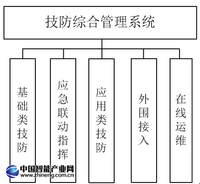 系統(tǒng)組成主要包括:基礎(chǔ)類技防、應(yīng)急聯(lián)動(dòng)指揮、應(yīng)用類技防、外圍接入、在線運(yùn)維五個(gè)部分。